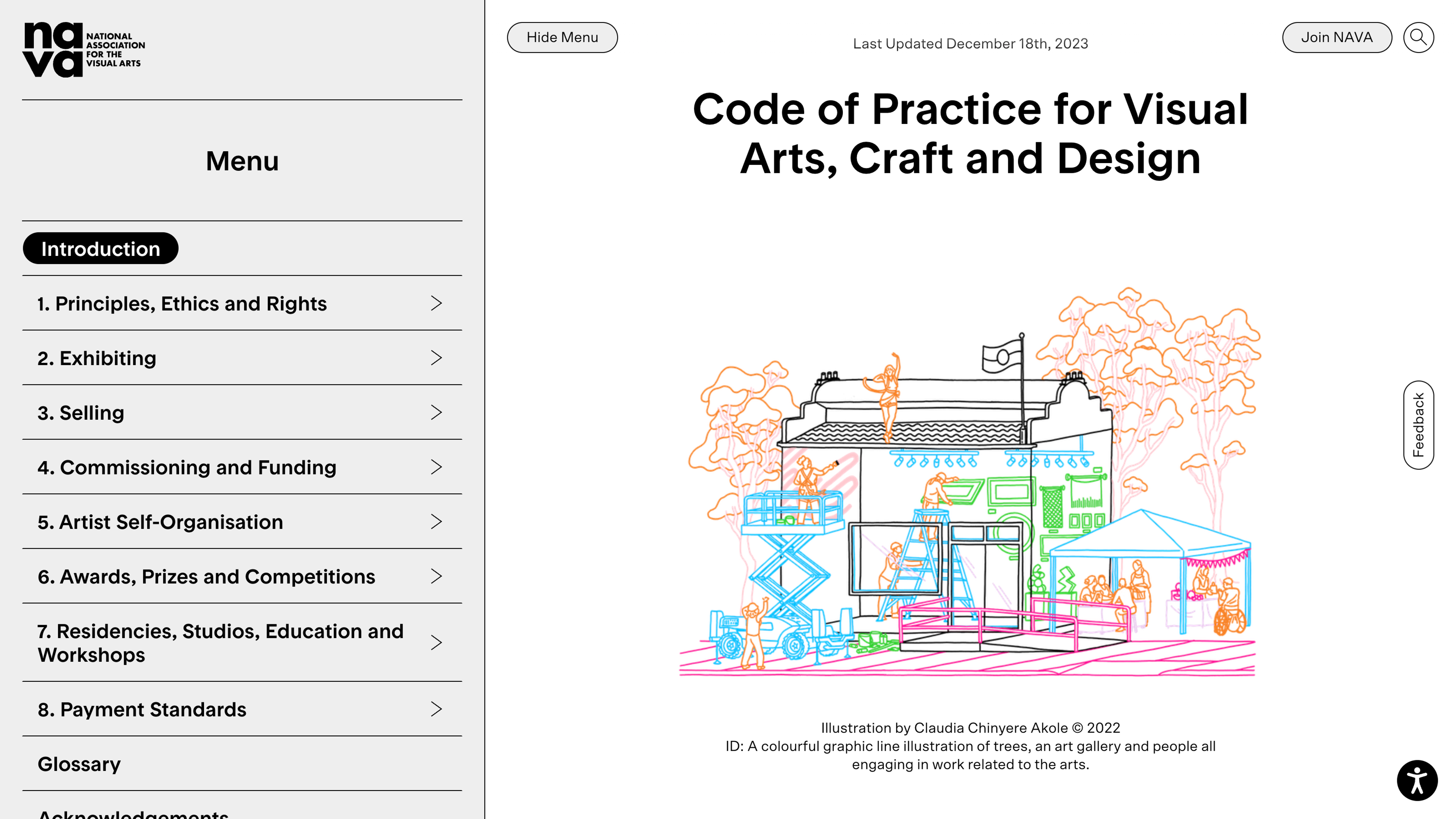 A knowledge base for the National Association of Visual Artists (NAVA) Code of Practice. Website design by Studio OK-OK, developed with an intentional focus on end-user experience.